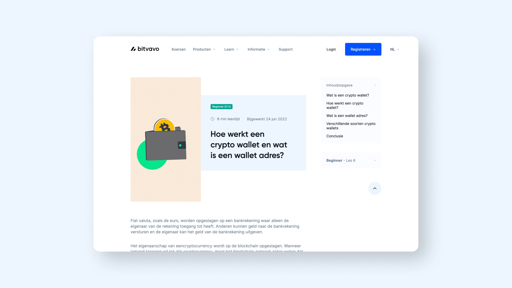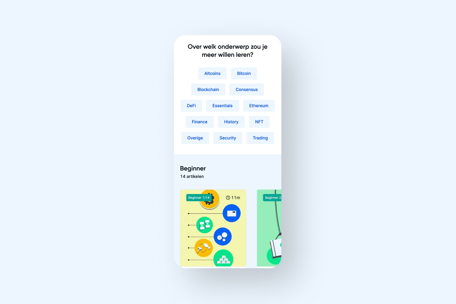 Waar begin je als je je wilt verdiepen in de wereld van crypto? Je verdwaalt al snel in een doolhof van websites en losse artikelen zonder samenhang. Bitvavo Learn brengt daar verandering in. Een educatief platform waar kwalitatieve content op een overzichtelijke manier wordt gepresenteerd. Artikelen zijn gegroepeerd en worden aangeboden als courses. Zo gaan toekomstige handelaren goed geïnformeerd van start.