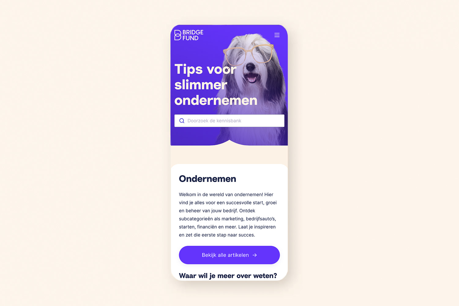 Tijdens de design fase is elke pagina ontworpen, voor desktop én mobiel. Daarbij hebben we een lang gekoesterde wens van BridgeFund handen en voeten mogen geven: een kennisbank. Vanuit UX, SEO en AEO oogpunt een slimme zet. Daarnaast zag de nieuwe Werken bij BridgeFund subsite het levenslicht waarbij we nauw hebben samengewerkt met Recruitment Marketing agency Cowboys.