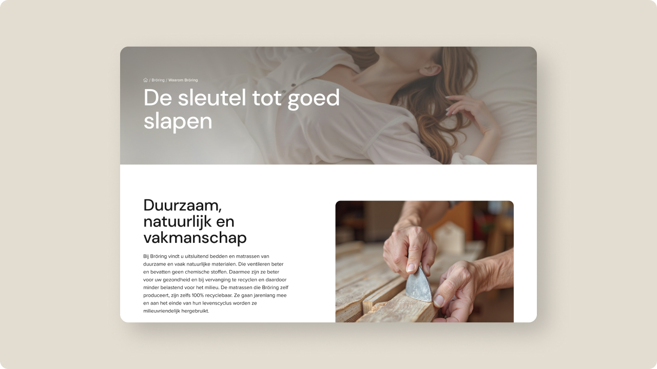 Bröring is al meer dan een eeuw een begrip in Amsterdam. Wat ooit begon als een textielwinkel aan de Javastraat, is uitgegroeid tot een specialist in maatwerk bedden in het hogere segment. Op hun fysieke locatie in Amsterdam-Zuid draait alles om vakmanschap, gastvrijheid en slaapcomfort van het hoogste niveau. Maar online sloot het merk niet meer aan bij de beleving die je in de winkel direct voelt. Hoog tijd voor een nieuwe digitale presentatie. Eentje die recht doet aan het verhaal áchter het bed.