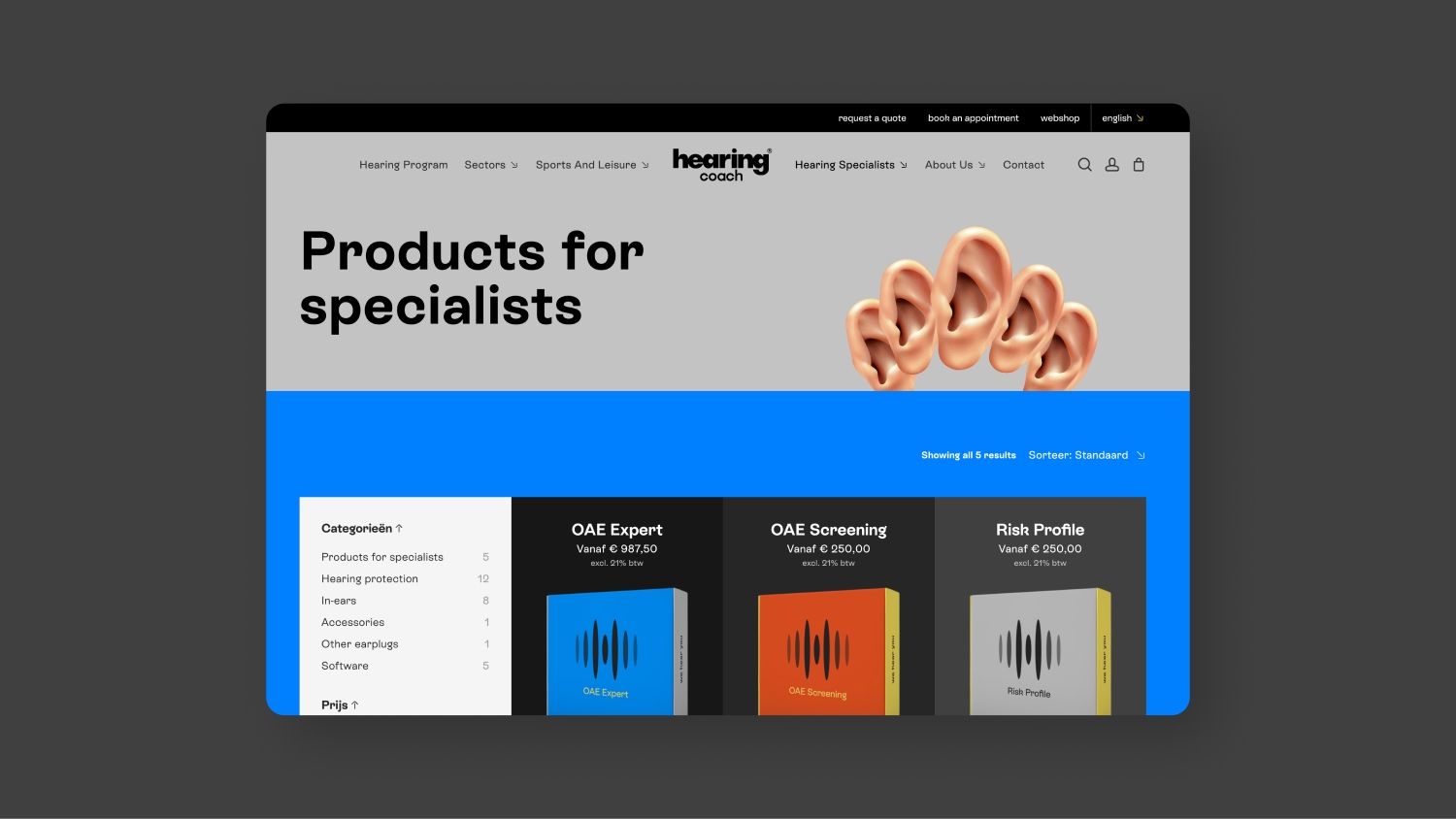 HearingCoach ontzorgt bedrijven op het gebied van gehoorzorg. Toch willen ze klanten de vrijheid geven om – buiten het Healthy Hearing Program – direct producten aan te schaffen zonder te moeten schakelen met een accountmanager. Hiervoor hebben we een e-commerce omgeving geĂ¯ntegreerd binnen de website. In tegenstelling tot de eerdere e-commerce omgevingen is dit een daadwerkelijke integratie. Hierdoor blijven bezoekers binnen de website en is er sprake van één beleving.