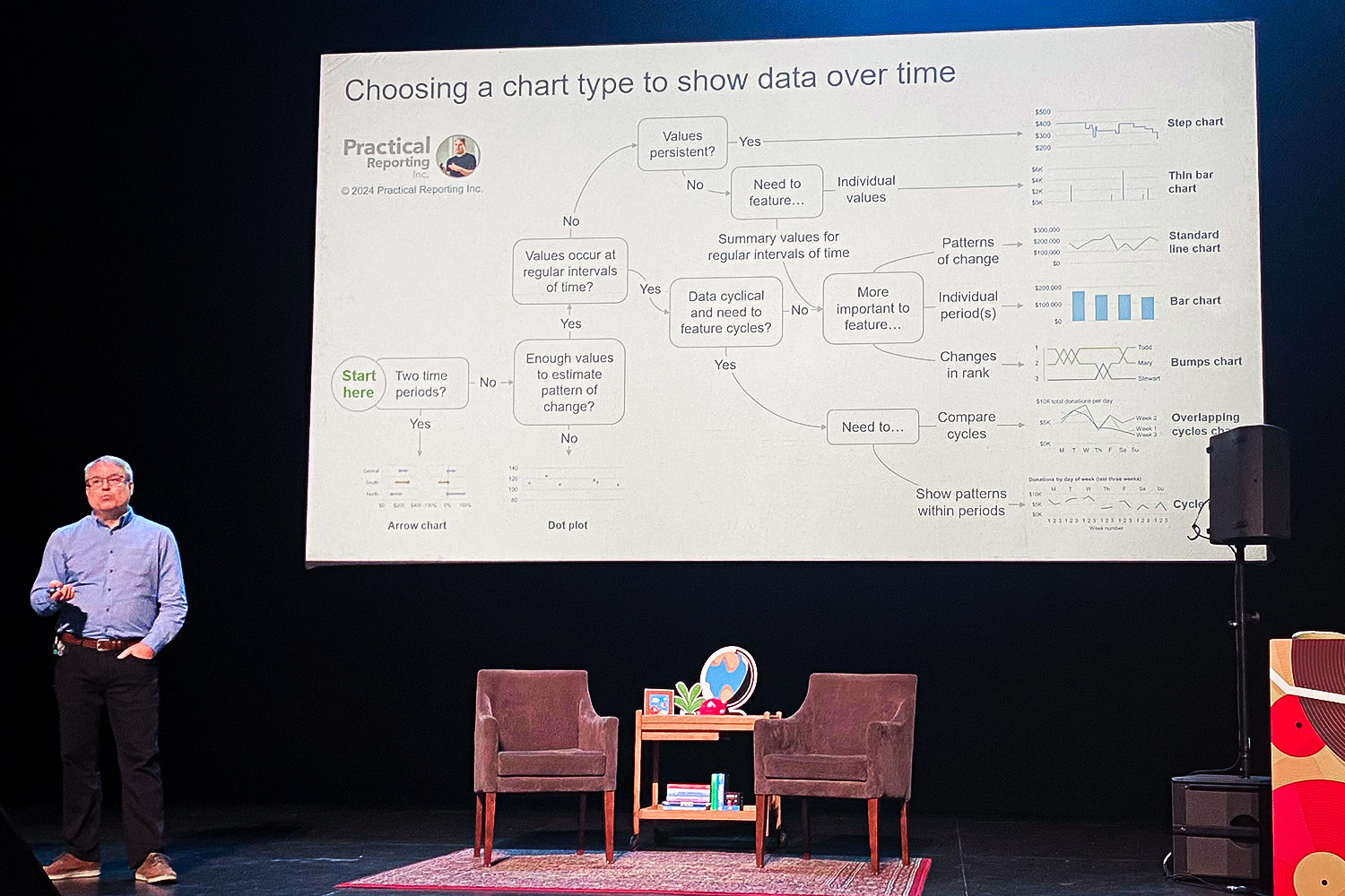 Datavisualisatie is een andere uitdaging die op de conferentie werd behandeld. Voor veel mensen roept een grafiek al snel het beeld van een lijndiagram op, maar expert Nick Desbarats benadrukte dat verschillende diagrammen verschillende soorten gegevens en trends het beste kunnen uitdrukken. Denk bijvoorbeeld aan ranglijngrafieken voor het tonen van relatieve prestaties, puntdiagrammen voor correlaties of zelfs stapcharts voor complexe trends.